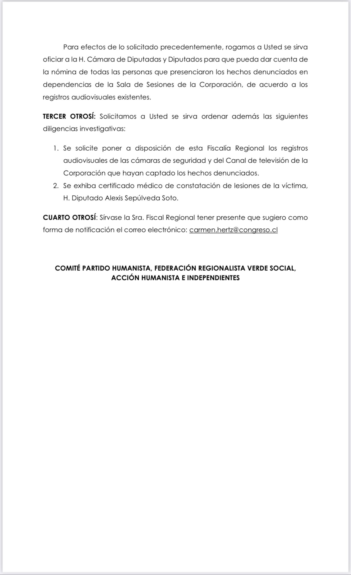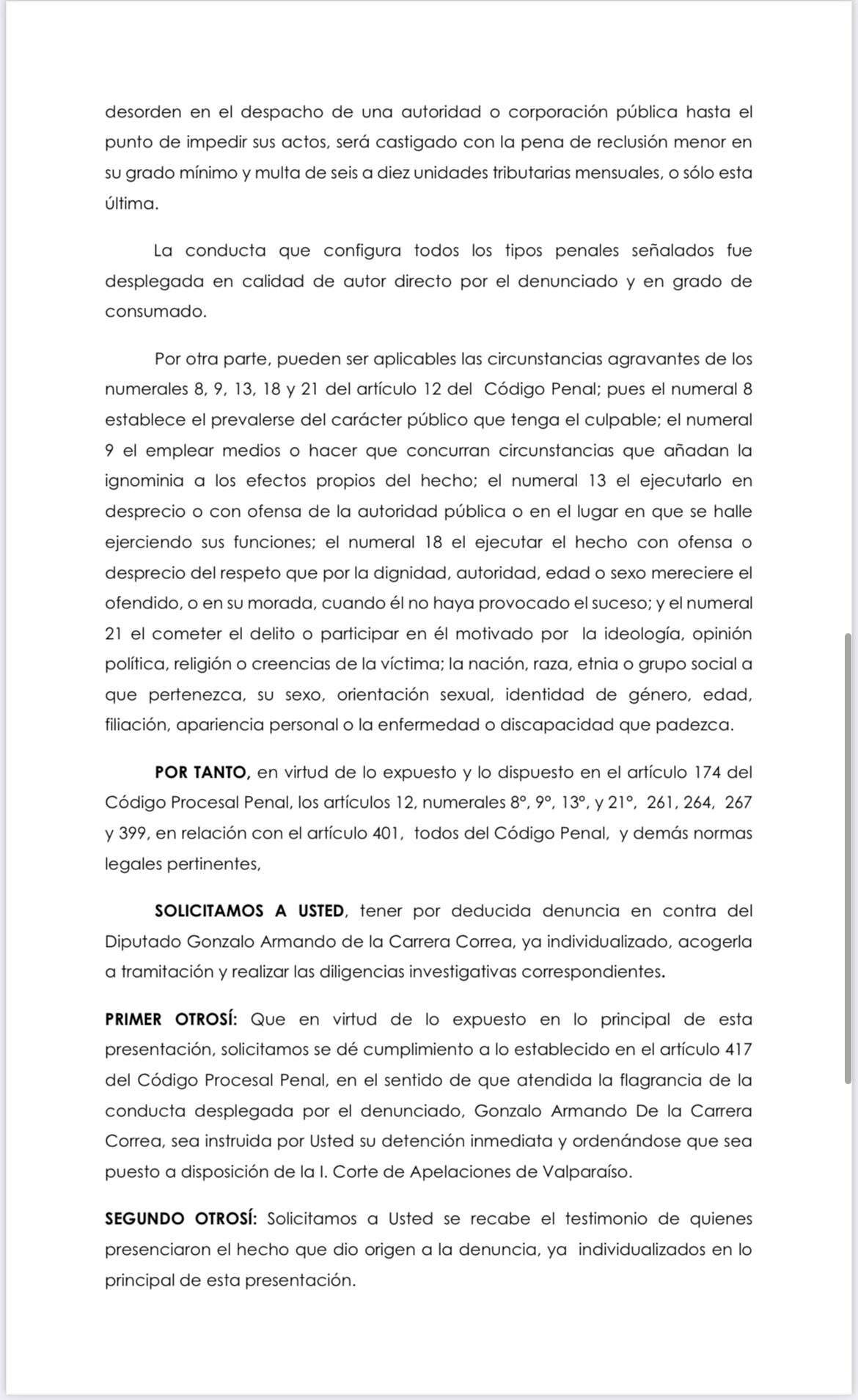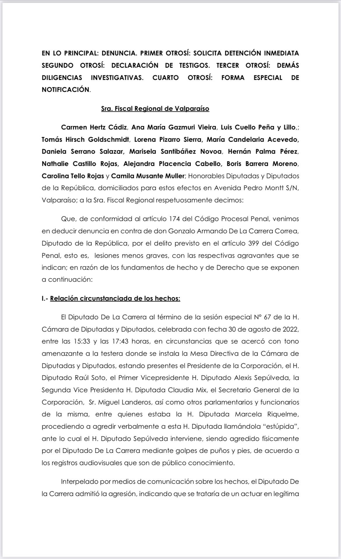 Presentamos junto a diputadas y diputados del Comité Partido Comunista, Frente Regionalista Verde Social, Acción Humanista e Independientes, una denuncia contra diputado De la Carrera por sus actos violentos el día de ayer en la Cámara de Diputadas y Diputados. Esperamos pronta respuesta del Ministerio Público y que se concrete su detención.