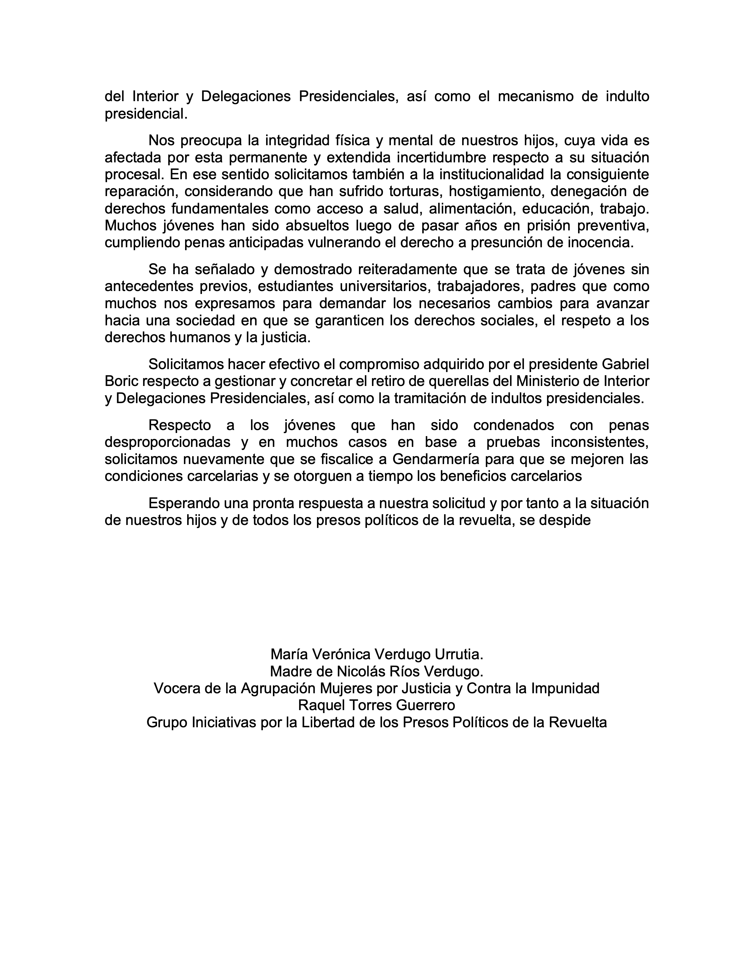 “Preocupa la integridad física y mental de estos jóvenes, cuya vida es afectada por esta permanente y extendida incertidumbre respecto a su situación procesal”, dice la diputada. Familiares solicitan hacer efectivo el compromiso adquirido por el presidente Gabriel Boric respecto a gestionar y concretar el retiro de querellas del Ministerio de Interior y Delegaciones Presidenciales, así como la tramitación de indultos presidenciales.